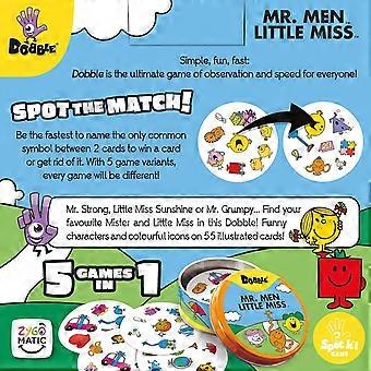 ICONIC MR. MEN & LITTLE MISS CHARACTERS: Dive into the delightful world of Mr. Men & Little Miss with this special edition of Dobble, featuring all your favourite characters like Mr. Strong and Little Miss Sunshine on 55 vibrantly illustrated cards. ENGAGING OBSERVATION & SPEED CHALLENGE: Test your reflexes and observation skills Be the first to spot the matching symbol between any two cards to win, making every round thrilling and fun for players of all ages. COMPACT AND TRAVEL-FRIENDLY: Packaged in a small, durable tin box, this game is ideal for on-the-go entertainment. Whether you´re traveling, at a party, or just enjoying family time, it´s the perfect gaming companion. 5-IN-1 GAMEPLAY VARIATIONS: Keep the excitement alive with 5 different game variants included Whether you´re playing with kids or adults, each game offers a unique and fun experience, ensuring endless replayability. ACCESSIBLE FAMILY GAME FOR AGES 4+: Designed for 2-8 players and suitable for ages 4 and up, Dobble Mr. Men & Little Miss ensures a quick, engaging, and inclusive gaming experience for the whole family, with an average playtime of 15 minutes.