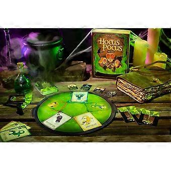 Disney Hocus Pocus: The Game, based on the 1993 movie "Hocus Pocus", players must work together to ruin the Sanderson Witches potion three times before the sun rises. Players hold a hand of ingredients of different types and colors and attempt to match all ingredient types or colors in the cauldron. Each turn, players ask a question about other players hands, referring to the ingredient type or color (but not both). (For example, Who has blue ingredients? or Who has newt saliva?) They then play a card from their hand into the cauldron and draw back up to three cards, ending their turn.