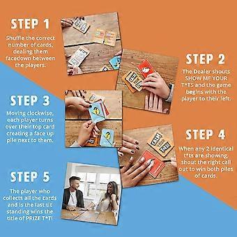 The aim of this titillating pairs game for very silly adults is to win all the cards or be the last tit standing Players win cards for correctly shouting "Nice tits" or "Tough tits" when a matching pair shows, or for having the quickest hand action when the Fat Balls appear. And watch out when the Pussy Posse are on patrol...things could easily go tits up