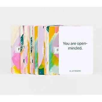 Flatter Me is a compliment battle card game for two players that makes giving and receiving compliments a little easier by turning compliments into a competition This quick-to-learn, family-friendly battle of kind words takes 15 to 30 minutes to play.As in the classic card game War, each round, both players simultaneously reveal the top card from their stack. If your revealed card best suits your opponent´s personality, they take both cards; if their card best suits your personality, you get both In the event of a tie where both cards fit both players or neither card is a good fit, draw three more cards and reveal the fourth. Winner takes all. Repeat until the tie is brokenOnce both stacks are gone, whoever received the most compliment cards wins.