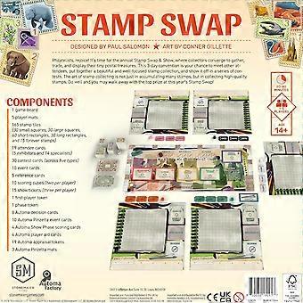 Stamp collecting is brought o life on tabletops in Stamp Swap Draft stamps and cards, then simultaneously cut, choose, arrange, and showcase a growing stamp collection The art of stamp collecting is not just in accumulating many stamps, but in collecting high-quality stamps (including rare gold-foil stamps). This 3-round game for 1-5 players is your chance to meet other attendees, put together a beautiful and well-focused stamp collection, and show it off in a series of contests.