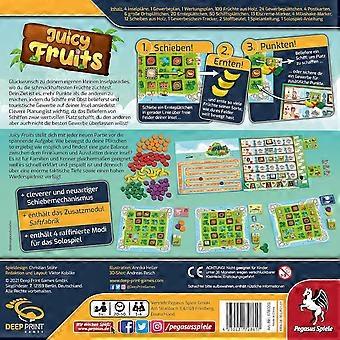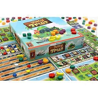 Each player has their own small island paradise where they grow delicious fruit. To win, you must gain the most points by cleverly supplying ships and by adding the best businesses to your island. Your turn in Juicy Fruits works like this: First, you slide one of your fruit collector tokens a number of unblocked spaces and collect that many fruits of the token´s type: banana, orange, lime, pomegranate, or mangosteen. Then you may either fulfill the order of a ship on your shores or claim a business from a shared display and place it onto your island (or do nothing). Clever planning and timing is vital because until you supply the ships on your shores, they block valuable island space which could be used to collect more fruit — but if you concentrate too much on the ships, the most promising businesses may get snatched by your opponents. Also, the sooner businesses are claimed, the quicker the game might end. With each play, Juicy Fruits poses new puzzles of how to move your tokens efficiently and how to balance clearing your island with claiming businesses. The game also includes an additional "juice factory" mode and four modes of solo play.