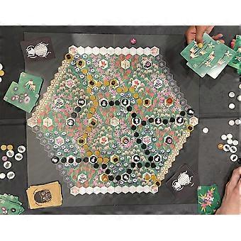 In Garden Guests, players compete to form a continuous path across a garden board that features beautiful paper cut art. On a turn, each player on a team — a team can be one or multiple players — can draw cards, give cards to a teammate, or use their cards to build a tower or extend their path. Towers are necessary in order to create a path between your base and a tower, or from one tower to another — but if you haven´t yet connected a tower to your path, your opponents can take it if they have cards to make a larger tower. To make a path, a player must play cards that match the colors of each space in the path. Once a path is made, it is permanent, and your opponent may have to wind their own path around yours. The first team to make a path all the way across the board wins