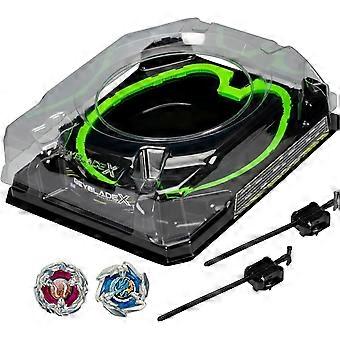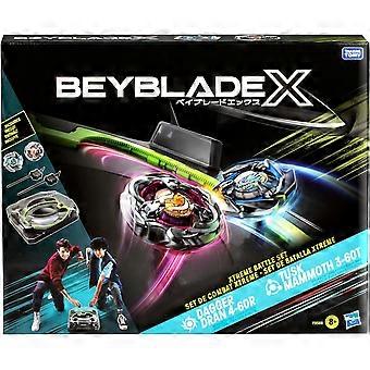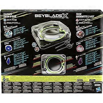 Experience the thrill of the next generation of Beyblade tops, Beyblade X. The Beyblade X Xtreme Battle Set has all you need to begin your quest for Beymastery. The Xtreme Beystadium (43.8 x 35.5 cm; 17.2 x 14 inches) and two Beyblade X right-spin tops feature the X-Celerator Gear System to level up your game and prove it in battle When the gear of the top engages the stadiums X-Celerator Rail, it can super-accelerate into an Xtreme Dash rocketing it around the arena for crushing collisions. Use the two launchers to unleash the Dagger Dran 4-60R Attack Type and Tusk Mammoth 3-60T Balance Type tops. Bladers launch their top against their opponents scoring points with each clash first to 4 points wins. Mix and match the interchangeable blade, ratchet and bit with the layers of other Beyblade X tops (sold separately) to create your own unsurpassable top.