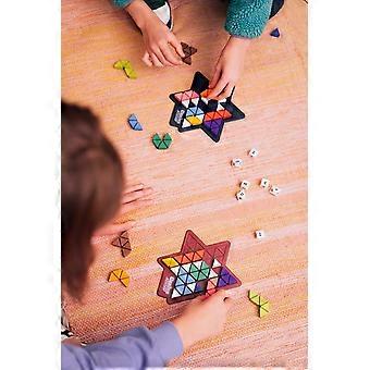Each player receives their own Genius star grid and a set of shapes and ´´blockers´´pieces. Roll all seven of the dice together and place a ´blocker´ piece into the triangle matching the seven numbers that appear on the dice. Now race your opponent to fill other space on the grid using the eleven shapes. All 165 888 puzzles have at least one possible solution. As soon as somebody finishes first, roll the dice and play again.