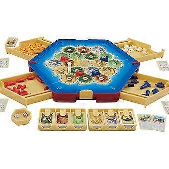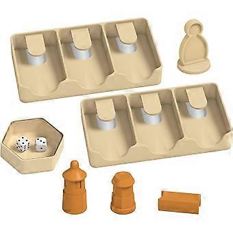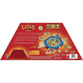 Catan: Traveler Compact Edition is a travel version of Catan that recreates that gameplay experience with a few limitations based on the smaller size of the board. In the game, players are trying to be the first to have ten victory points, with points coming primarily from cities and settlements built on the game board. On a turn, the active player rolls dice and players receive resources based on the die roll and what they´ve built on the board. The active player can then trade with opponents and build roads, cities and settlements depending on the resources in hand and available space on the board. In this travel version of the game, the land spaces aren´t individual hexes, but six pieces of material that can be rearranged in different ways to change up the game board. The player pieces and resource cards fit into drawers on the side of the game board, which folds into a trapezoid. Catan: Traveler Compact Edition includes a two-player variant using cards that allow one player to force a "trade" with the other. When this happens, the first player takes two cards from the opponent, then gives that player any one card in return.