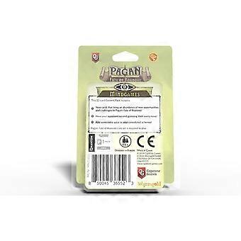 Pagan: The Fate of Roanoke is an expandable and asymmetrical card game with one player taking on the role of the Witch and the other the Witch Hunter. The Witch attempts to carry out a ritual before being exposed and eliminated by the Witch Hunter. The Mind Games content pack expands the base game by bringing an abundance of new opportunities and challenges to Pagan: Fate of Roanoke. Whether you are looking to have your opponent second-guessing your every move or to add some extra spice to your convoluted schemes, these cards are sure to satisfy the needs of both Hunter and Witch. As the Witch strives to complete a ritual, the Hunter tries to track the Witch down and find out its true identity. Both players access variable card decks with 50 cards each and use different resources to defeat the other side. Many tactics and strategies are possible and necessary to survive in this fight between the two powers. Embedded in the dark graphics of illustrator Maren Gutt, the fictional story of the lost colony of Roanoke comes to life. Nine villagers are under suspicion and only the Witch knows who the real witch is. Each turn, the two players use their action pawns on active villagers to draw cards, play cards, and gain influence. Moreover, the Witch can brew powerful potions, improve their familiar, and cast enchantments and charms. Meanwhile, the Hunter will be enlisting allies, claiming strategic locations, and ruthlessly investigating the villagers.