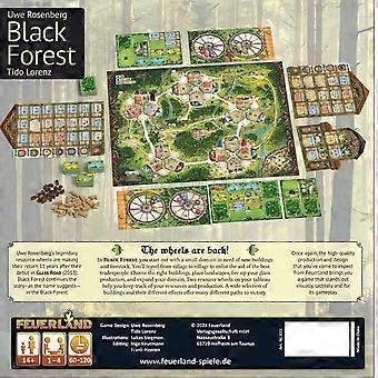 In Black Forest, you start out with a small domain in need of new buildings and livestock. Youll travel from village to village, to enlist the aid of the best specialists. Exploiting the abilities of these specialists lets you collect resources, lay out new landscape tiles (e.g. ponds and fields), and build a variety of buildings, which come in four types. Choose the right buildings, place landscapes, fire up your glass production, and expand your domain. Uwe Rosenbergs resource wheels, made famous in Glass Road (2013), return in Black Forest. Two resource wheels on your tableau help you keep track of your resources and production. Black Forest continues the story - as the name suggests in the Black Forest. Among others, the main difference between the two games is the use of worker placement in Black Forest instead of simultaneous action selection. A wide selection of buildings and their different effects offer many different paths to victory.