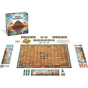 In Terra Pyramides, players compete for the purchase of construction sites to build pyramids of different sizes. They need money, resources, and workers to build the most magnificent pyramids for which they earn points. Whoever has the most points at the end of the game wins. Each player must place exactly one tile on the game board in one round. Then all the tiles on the game board are activated, which lie in a straight or diagonal line to the just laid token. On the tiles there are workers, raw materials and money that can be activated/received by the player. Workers and raw materials are needed to build pyramids. Workers must "wander" to the pyramid construction sites in an uninterrupted straight or diagonal line. If a player has enough raw materials and three of his workers on a construction site, he is allowed to build another level for this pyramid, earning him points. Money can be used for bonus promotions, e.g. to obtain wild raw materials or to search a stack and select a plate. The game ends when all tile stacks are used up. Each pyramid is worth points depending on how far a player has occupied the pyramid. Leftover raw materials and money are also worth points. Terra Pyramides comes with two extensions in the box. While the basic game is more aimed at family players, the expansions add additional strategic elements that make the board game more complex.