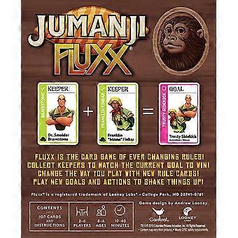 Fluxx is a card game in which the cards themselves determine the current rules of the game. By playing cards, you change numerous aspects of the game: how to draw cards, how to play cards, and even how to win. At the start of the game, each player holds three cards and on a turn a player draws one card, then plays one card. By playing cards, you can put new rules into play that change numerous aspects of the game: how many cards to draw or play, how many cards you can hold in hand or keep on the table in front of you, and (most importantly) how to win the game. Jumanji Fluxx features the gameplay of Fluxx and characters and events from the Jumanji film. Note that the Looney Labs edition of the game includes seven additional cards and a collector´s coin used in gameplay; these cards won´t be included in the edition from Cardinal Games, but will be sold separately by Looney Labs.