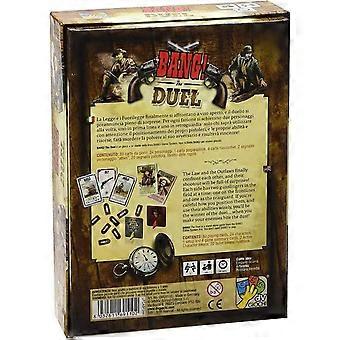 BANG The Duel is a two-player version of BANG in which each player chooses a certain number of characters from a personal deck, with one deck containing lawful individuals and the other one outlaws; the more characters you choose, the longer the game. Each player starts with two characters in play, with one being in front of the other. Each player also has an individual deck of action cards, with the lawful player specializing in drawing cards and the outlaw player specializing in tricks. Players take turns playing cards, trying to take out the opponent´s characters. As you do, new characters come into play, and whoever eliminates all of their opponent´s characters first wins.