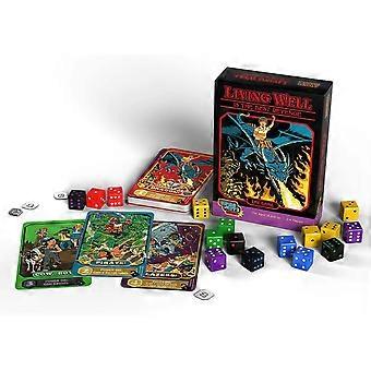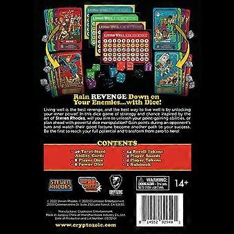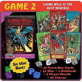 Living Well Is the Best Revenge is volume 2 from the Steven Rhodes Games collection. Features unique retro art based on the work of popular artist Steven Rhodes. This card and dice game features fast-paced and easy to learn gameplay, that requires little setup. With hidden depth to satisfy hardcore gamers. In Living Well is the Best Revenge, bury your opponents in a pile of points in a dice game of fantastic proportions.