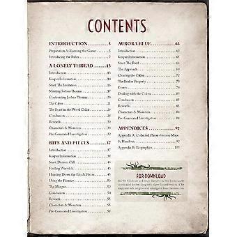 No Time to Scream contains three short-play scenarios for the Call of Cthulhu roleplaying game. Each scenario is perfect for a single evening of mystery and horror, designed to be played in around two hours. A Lonely Thread: something is wrong with Professor Thomas. Unfortunately, you didn´t know that when you arrived at his charming woodland cabin. Can you act in time to save your friend? Or will a horrific secret devour all? Bits & Pieces: a doctor´s body lies next to an autopsy table, and the corpse he was examining has vanished The only clue is a set of bloody footprints. A devilish game of hide and seek ensues--with gory consequences. Aurora Blue: a band of US Treasury agents raid an illegal whiskey distillery hidden in Alaska´s Chugach Mountains. The sun is setting... and that´s when the really bad things come out to play. Each scenario includes four pre-generated investigators, allowing you and your players to jump right into the action. No Time To Scream is designed for use with either the Call of Cthulhu Starter Set or the Call of Cthulhu: Keeper Rulebook.