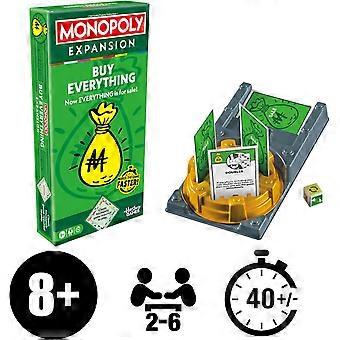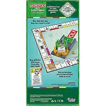 A FRESH WAY TO PLAY THE CLASSIC MONOPOLY GAME: spice up the Monopoly game and play in less time with this Monopoly Buy Everything Expansion THIS IS AN EXPANSION, NOT A STANDALONE GAME. (CLASSIC MONOPOLY GAME REQUIRED TO PLAY. Sold separately)PLAY IN HALF THE TIME: play the Monopoly family board game in about 40 minutes with this quick-playing expansion It´s great for fitting in fun mischief with family and friends at any timeEVERYTHING IS FOR SALE: add this expansion to the Monopoly game and enjoy the classic Monopoly gameplay players know plus an easy-to-learn twist Players can buy every space, abilities and ways to winBUY EVERY SPACE (EVEN JAIL): buy Free Parking, the GO space, the Bank, Jail and more Includes eight Title Deeds to add to the classic Monopoly gameBUY SPECIAL ABILITIES FROM THE SALE VAULT: the Sale Vault displays a rotating variety of game-changing cards. Players roll the Buy die to try to purchase one. Some Sale cards give players abilities to gain an edge.