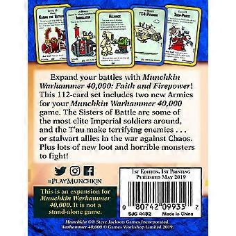 Expand your battles with Munchkin Warhammer 40,000: Faith and Firepower This 112-card set includes two new armies for Munchkin Warhammer 40,000. The Sisters of Battle are some of the most elite Imperial soldiers around, and the T´au make terrifying enemies...or stalwart allies in the war against Chaos. Plus lots of new loot and horrible monsters to fight