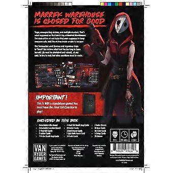 In The Marrek Murders, the media has become fascinated by an unorthodox killer being referred to as The Tormentor on account of her method of placing her victims in deathtraps that are escapable... in theory. Why she does this is still being investigated, but people are dying and now you find yourself in one of her deathtraps... Marrek Warehouse is a mid-sized warehouse that handles shipping and fulfillment for a variety of departments store brand catalog sales. The operators have won awards for the efficiency of their floor layout and particularly the formation of the pallet racks. The warehouse security system is state-of-the-art with a timed locking and unlocking mechanism for all of the exits including the bay doors. The management (or whoever is in charge, ahem the killer) can control everything both coming into, and leaving, the warehouse. Requires Final Girl Core Box to play.