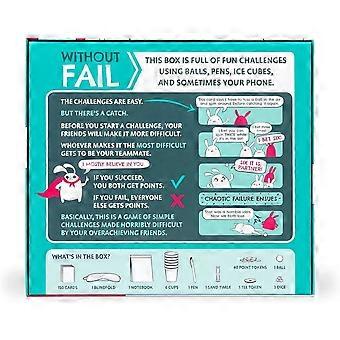 How to Play: Start by setting up a challenge from the top card in the deck. Your friends then make the challenge harder, and you try to complete it with the help of your chosen teammate. Succeed, and both of you score What’s Included: 150 Cards, 1 Blindfold, 1 Notebook, 6 Cups, 1 Sand Timer, 40 Point Tokens, 1 Tee Token, 1 Ball, 3 Dice. Everything you need for endless fun and outrageous challenges. Who’s it For? Perfect for parties and gatherings, ideal for breaking the ice with new groups or testing the limits of old friends. Guaranteed to get everyone laughing and involved. Where to Play: Suitable for any space where you can perform physical challenges. Whether it’s at home, a party, or a casual get-together, this game brings the fun wherever you are. Our Story: From the creators of Exploding Kittens, the game that redefined Kickstarter success, comes Without Fail. Known for our quirky and engaging games, we bring you a new way to challenge and entertain with our signature playful twist.
