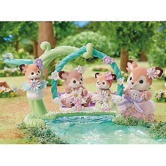 The Deer family have adorable big ears. This set contains the Deer baby and cradled babies in matching floral outfits with an ivy swing and lily of the valley cradle. The babies can sit in the swing by the water or in the lily of the valley cradle. The figures have different colours and ear patterns The cradled babies are caramel-coloured, while the baby is cocoa-coloured with petal-patterned ears. There are flower and butterfly ear decorations for the babies to wear. The babies can also sit on the leaf, which has a clear drop of water on it.