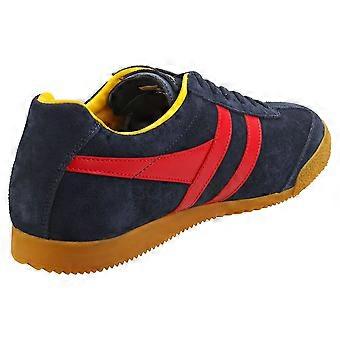 These Gola Harrier trainers in navy, red and yellow are a stylish blend of classic design and modern colour. Crafted from durable leather and suede, they offer both comfort and lasting wear. The textile lining and insole provide cushioned support for all-day wear, while the rubber sole ensures excellent grip on a variety of surfaces. Securely fastened with laces, these trainers effortlessly elevate any casual look.