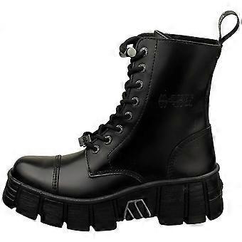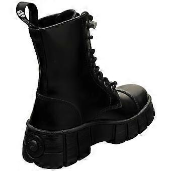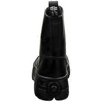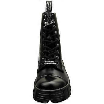 These black New Rock ankle boots exude a timeless cool. Crafted from durable leather, they offer both style and substance with their textile linings and insoles for added comfort. The robust rubber soles ensure grip and stability, making them perfect for navigating urban landscapes. The classic lace-up fastening allows for a secure and customizable fit.