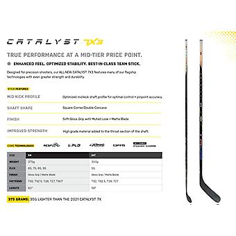 TRUE PERFORMANCE AT A MID-TIER PRICE POINT. ENHANCED FEEL. OPTIMIZED STABILITY. BEST-IN-CLASS TEAM STICK. Designed for precision shooters, our ALL-NEW CATALYST 7X3 features many of our flagship technologies with even greater strength and durability. MID-KICK PROFILESHAFT SHAPEFINISHOptimized mid-kick shaft profile for optimal control + pinpoint accuracy. Square Corner/Double ConcaveSoft Gloss Grip with Muted Look + Matte BladeSTICK FEATURESDesigned for precision shooters, our ALL-NEW CATALYST 7X3 features many of our flagship technologies with even greater strength and durability. TRUE PERFORMANCE AT A MID-TIER PRICE POINT. ENHANCED FEEL. OPTIMIZED STABILITY. BEST-IN-CLASS TEAM STICK. CORE TECHNOLOGIESIMPROVED STRENGTH High-grade material added to the throat section of the shaft. SIZE SR INTWEIGHT 375g 350gFLEX 65, 75, 85, 95 55FINISH Gloss Grip / Matte Blade Gloss Grip / Matte BladePATTERNS T92, T92.5, T28, T27, T90T T92, T92.5, T28, T27LENGTH 62" 58"375 GRAMS: 35G LIGHTER THAN THE 2021 CATALYST 7X